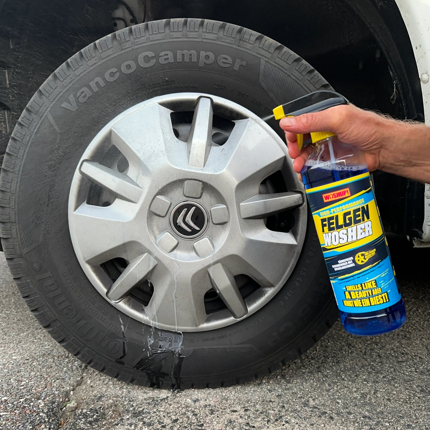 Der Woshup Felgen Wosher arbeitet ohne diese stinkende Chemie.