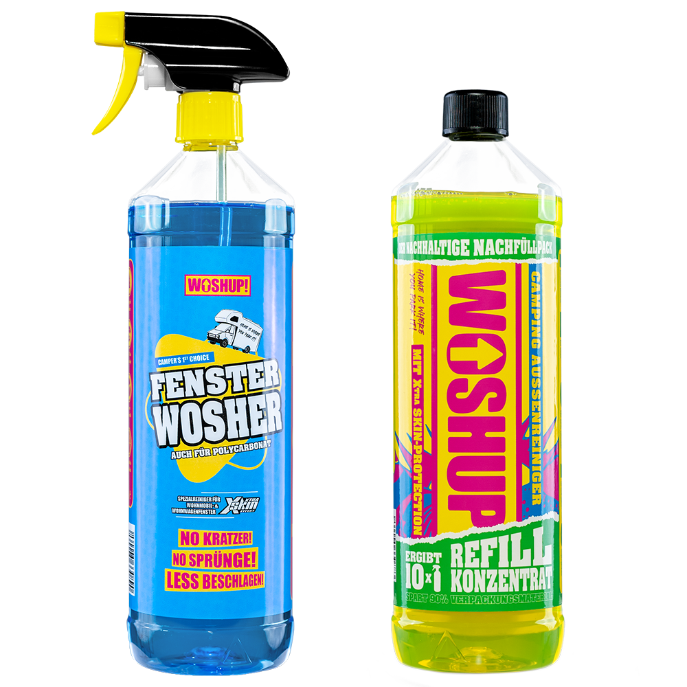 Wir sind dein Power Duo aus Fenster Wosher und Camping Reiniger! Gemeinsam rücken wir an um deinem Camper den Rundum-Glanz zu liefern, den er sich nach jedem Trip reichlich verdient hat! 💪🏼 Und unsere besondere Gemeinsamkeit, der Xtra Skin Effekt, lässt ihn sogar noch länger strahlen! 🤩 Also, worauf wartest du noch?