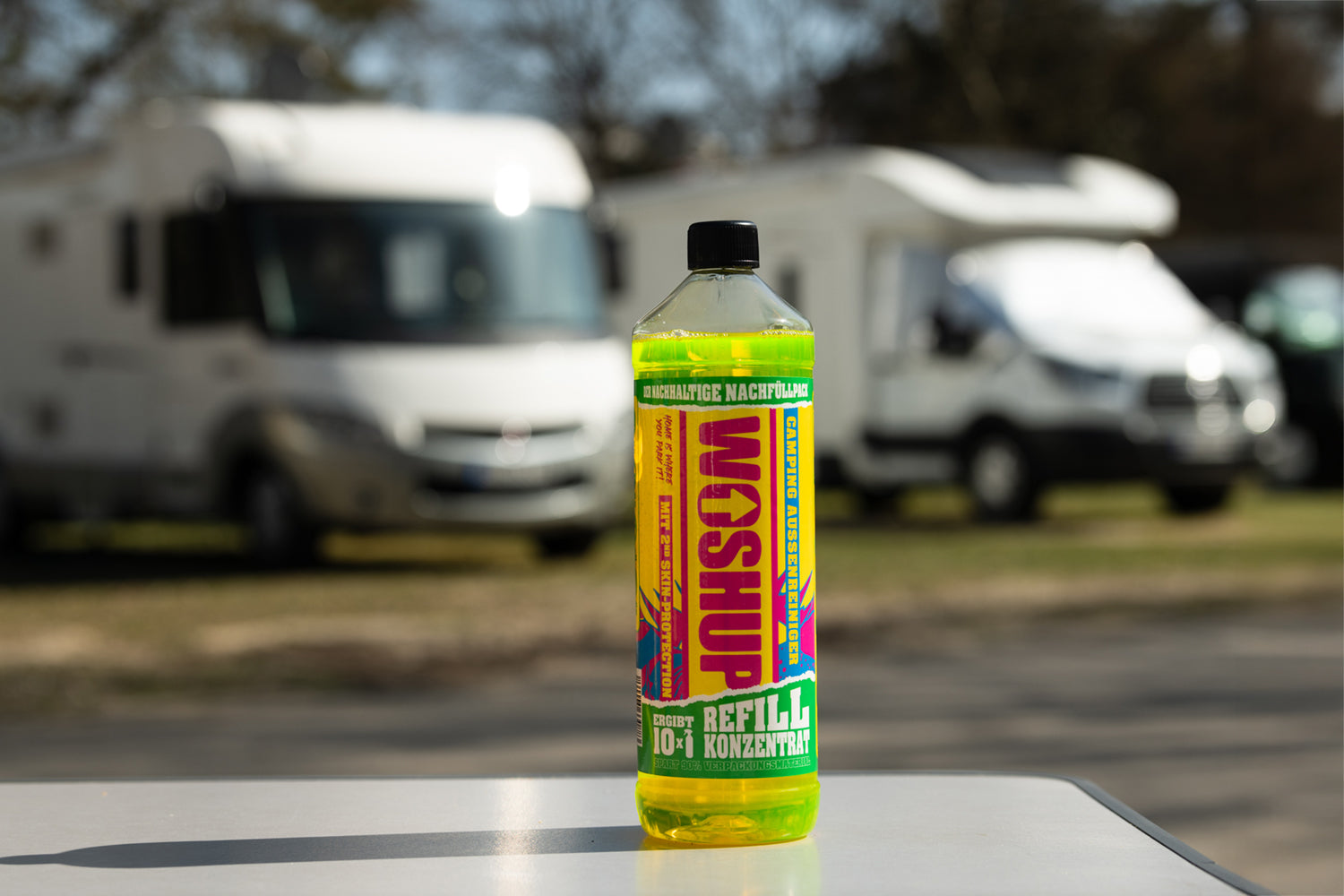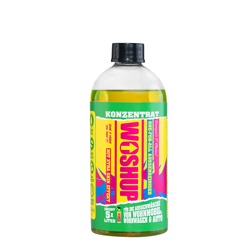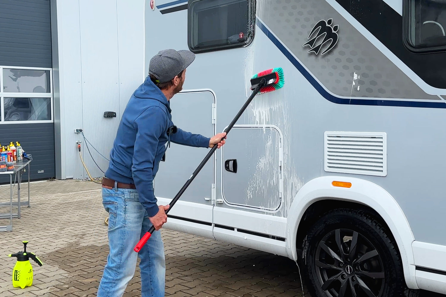 Zuerst mischst du den Reiniger anhand der Skala, die auf der Flasche abgedruckt ist an. Am besten in einem Eimer oder Drucksprüher. Danach den Camper einmal kurz nass machen, dann das Produkt einfach aufsprühen, kurz einwirken lassen, mit einer geeigneten Bürste einarbeiten und dann nur noch mit Wasser abspülen. Im Anschluss daran können spezifische Verschmutzungen wie Harz, Insekten oder Regenstreifen mit einem unserer Spezialisten punktuell entfernt werden.