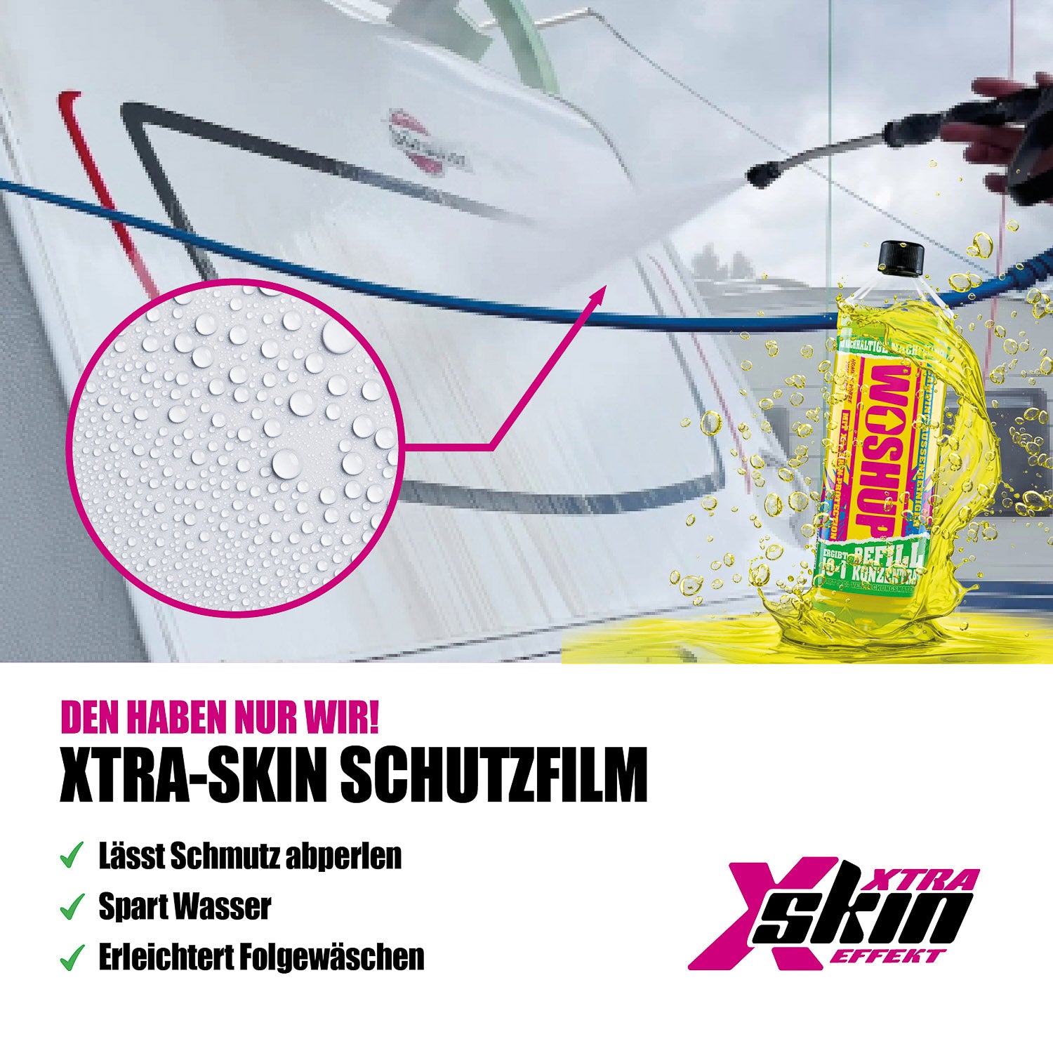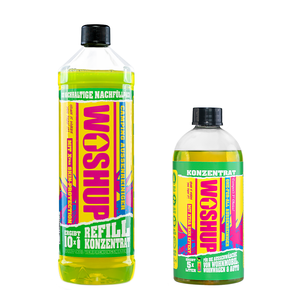 Im Vergleich zu vielen anderen Reinigern ist er natürlich viel ergiebiger. Er macht dir die Außenreinigung einfach maximal einfach und du musst dir absolut keine Sorgen um die sensible Außenhaut deines Campers machen, unsere Reiniger wurden speziell dafür konzipiert und verursachen keine Materialschäden! Unser Xtra Skin Effekt erspart dir außerdem viel Aufwand bei Folgewäschen, weil zukünftiger Schmutz weniger haften bleibt. Wie alle unsere Produkte riecht er außerdem super angenehm und stinkt nicht so penetrant wie andere Reiniger.