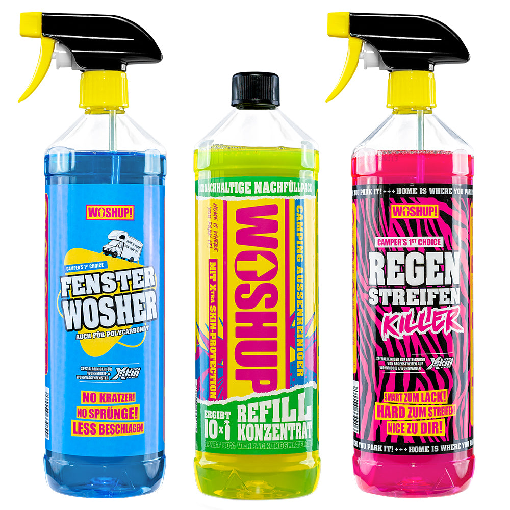 Mit diesem Set kann der komplette Wohnwagen wieder auf Vordermann gebracht werden. Dazu kann man je nach Verschmutzung noch Spezialreiniger gegen Harz und Insekten oder für Felgen und Innenraum hinzuziehen.